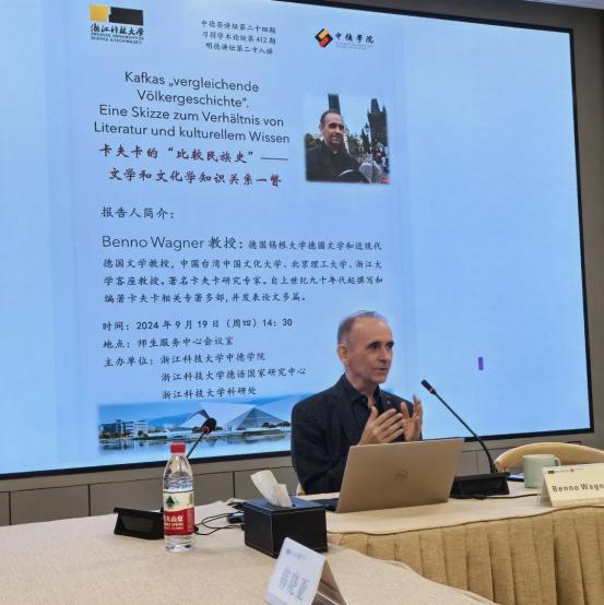 2024年9月19日,浙江科技大学中德学院、德语国家研究中心、科研处共同邀请德国锡根大学德语文学和近现代德语文学教授、浙江大学客座教授Benno Wagner做客明德讲坛,做题为“卡夫卡的‘比较民族史’——文学和文化学知识关系一瞥”的学术报告。本次报告由中德学院院长韩晓亚主持,中德学院教师、德语国家研究中心相关研究人员以及德语系学生等二十余人聆听了本场报告。
